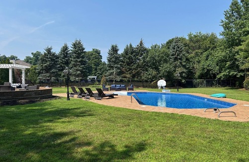 Welcome to our private estate like home in Saint James. Our 4-bedroom house is just as wonderful inside as it is outside. Walking out the sliding door to the back you will be greeted by a large, covered patio for morning coffee or afternoon cocktails. As you continue outside, you will find a large BBQ, Wood Burning Fire Pit, Pergola, Massive Pool, and Expansive Grass areas that round out this great fully fenced backyard. Perfect for relaxation as well as fun. Inside the open concept kitchen / den area is great for cooking a stunning meal for friends and family or relaxing from the day. The open concept living room / dining room is perfect for catching up on the day’s events or having great meals at the dining room table with room for up to 10 people. Each bedroom offers a brilliant mix of 1 king bed (master), 1 full bed (guest room 1), and 2 queen beds (other 2 guest rooms), ensuring a soothing night's sleep for all guests. With 2 and a half bathrooms, including bathtubs in both full bathrooms, getting ready for the day will be effortless. There is also a bonus with our very large basement that boasts a huge super comfy couch, 85" TV, and a fitness area if a workout is on your to do list. If getting out of the house is a better idea, St James town is less than 5 minutes (by car or 10 min walking) with restaurants for breakfast, lunch and dinner (and cocktails). This property is 20 to 25 minutes from Islip MacArthur (ISP) Airport and 30 to 35 minutes to Bethpage State Park.