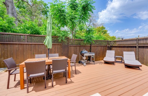 Quiet neighborhood, but close enough to downtown. Private backyard oasis includes pool, hot tub, covered patio with seating, dining table, charcoal grill, and two lounge chairs.