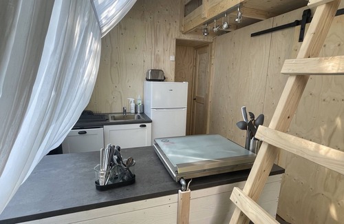 The kitchenette is equipped with a dishwasher, as well as a coffee maker, an electric kettle, and cookware. And you can even travel light because you'll have access to laundry facilities.