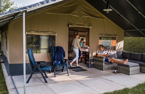 This lovely, detached safari tent is located on the modern terraced camping site Nommerlayen, adjacent to a beautiful forest. The holiday park is located in a green and water-rich hilly landscape near the small-scale town of Nommern, 30 km. north of the capital Luxembourg. The safari tent is comfortable, cosy and fully furnished. Here, you will experience the real camping feeling, but with just a little more comfort. There is a living area with an open kitchen, including a fridge, freezer and a hob. There are three bedrooms, one of which has a double box spring bed, one with two single beds, which may be set up as a double bed, and one with a single bed. The safari tent does not have a private bathroom. For the shower and toilet you use the central sanitary facilities at the campsite. Outside you will find a lovely covered terrace with garden furniture. There is parking for one car near the safari tent. At holiday park Camping Nommerlayen you can book various safari tents and tent lodges for five people. Some types of tents have their own sanitary facilities.