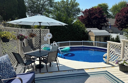 The main level opens to an 2 level, over-sized deck outfitted with a gas grill, outdoor dining and seating areas and a salt system above ground pool with deck off the house for a dip after a day at the beach or your adventures. PLEASE NOTE: The pool depth is less than 4 ft. There is no diving or jumping allowed. No children under the age of 18 are allowed in the pool or on the deck area without an adult present at all times. All guests swim at their own risk. A U.S. Coast Guard approved Life Ring is directly located on the deck by the pool and is NOT to be USED unless case of emergency. The deck gate must remained lock at all times.
