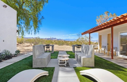 Welcome to Pine Desert Ranch, located in the Panorama Heights neighborhood of Joshua Tree, offering pristine views and relaxing vibes. Just a 5-minute walk gets you to the edge of JT National Park where you can hike as far as you want. Or walk 1 mile back towards the 62 to the brand-new Más o Menos for a latte or a cocktail. Once back home, sit beneath the stars in the spa, relax by the fire pit, or hit the game room for some arcade action before retiring for the night in Avocado beds.