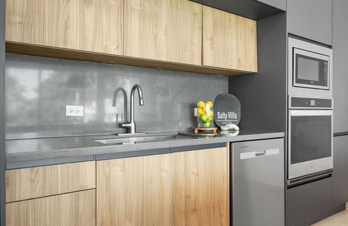 As you enter Salty Villa, you will have the modern living room to your right and the elegant custom kitchen and dining area to your left. The living room is adorned with two sleek leather sofas, a stylish coffee table, a flat-screen TV, and modern touches. Slide open the doors from the living room, seamlessly transitioning to the outdoor terrace, pool area, and patio. The indoor-outdoor flow is part of the magic that Salty Villa offers. There is a half bathroom on this level.