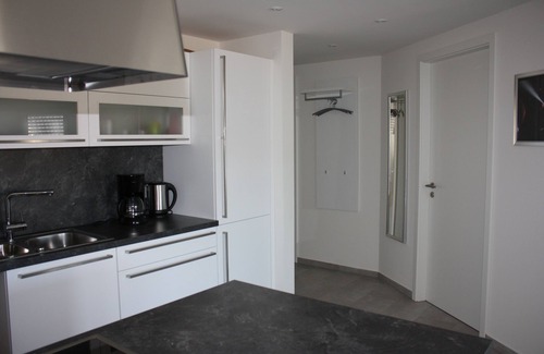 Let yourself be transported comfortably by elevator from the underground garage to the level of your holiday apartment on the first floor. The apartment convinces with its high quality building materials, the very comfortable equipment and the modern design in black & white style. Opened in May 2017, the apartment extends over a living space of 95 m², which is divided into two double rooms, two bathrooms and a cozy living area with dining area and integrated kitchen. The first bedroom is designed as a suite with an adjacent, privately accessible full bath. Here you sleep in a comfortable 180 cm x 200 cm box spring bed. The four-door wardrobe offers enough storage space for your travel wardrobe. The adjoining bathroom is designed with a recessed walk-in shower cubicle, a bathtub, a vanity unit underneath, a toilet and a bathroom window. The underfloor heating in all rooms counteracts cold feet. From this bedroom you enter the hallway with cloakroom, pass a storage room and the second bathroom on the left and find the second bedroom in front of the living area. This includes a box spring bed of the same dimensions and a three-door wardrobe. In both bedrooms you can comfortably lie in bed and watch TV on the wall-mounted flat-screen TVs before going to sleep. Electric roller blinds on all windows darken the bedrooms as desired. The second bathroom is accessible to all guests via the hallway. It is set up as a daylight shower room with a barrier-free shower and toilet and also with a washing machine and dryer. The heart of the apartment is the inviting living room with a spacious corner couch that invites up to four people to relax after a day trip. A large flat-screen TV with DVD player and home theater music system provides entertainment in the evening. Pass the dining table with six rocking chairs and enter the open kitchen with island. This allows you extensive self-sufficiency incl. Induction cooker, dishwasher, fridge and freezer combination, microwave and all common small electrical appliances. The Internet connection via WLAN rounds off the comfortable equipment. Either the 80 cm wide x 282 or 236 long couch, or two 90 cm x 200 cm large extra beds (can be set up in bedroom 1 or in the living area) acts as a sleeping facility for a fifth and sixth guest. The landlords are very interested in your comfortable sleep, which is why additional comfortable mattress toppers have been purchased. A free travel cot for babies and toddlers can be provided on request.