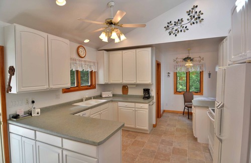The 2-bedroom lake home rental features a spacious living room with skylights and spectacular views of the lake. Relax, kick back and watch your favorite DVD on the flat panel TV. With WiFi Internet and central air, you’re sure to be comfortably connected and happy during your vacation.