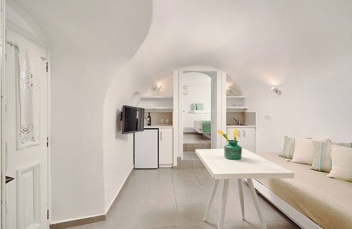 Private apartment is 55sqm and can accommodate up to 3 adults plus 1 child. Recently renovated, combines the traditional Cycladic architecture with modern elements in order to offer you the best and more comfortable accommodation during all the year round . It consists of 1 bedroom, 1 indoor & 1 outdoor hot tub, 1 bathroom, small equipped kitchen and living room with 2 sofa beds .