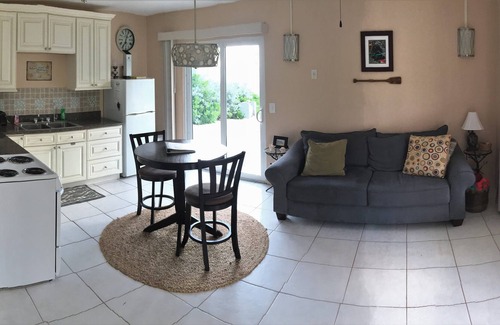 Hear and see the ocean in this beautiful, remodeled 670 Sq. Ft, one bedroom ocean view cottage features an open floor plan enabling you to interact with others easily. the Cottage is sharing the property with another 2 bedroom Main house "Escape from Reality". It has central air, living room areas, all new kitchen with gorgeous vanilla cabinetry and quartz countertop, new appliances, bottled water quality water through an iSpring 5 Stage water purifier, new furniture, new premium pillow top mattress and updated bathroom. The living room has a 42" flat screen "smart" HDTV. WiFi, Roku, Netflix and IHeart Radio access included. The house sleeps up to 4 when using the queen size hide-a-bed located in the living room. Included in each house are free WiFi, Netflix, several games, paperbacks, stateside phone for free calls, and a local cell phone. The house is not suitable for small children due to the decorative items. You can also experience a local game using the local soldier crabs or "hermit crabs" in a circle and seeing whose wins the race to the food in the center. Whenever we are there my daughter takes a little leftover food out each evening and they have come to expect it and show up for "dinner". They range in size from baseball size hermits to tip of your pinky sized ones.