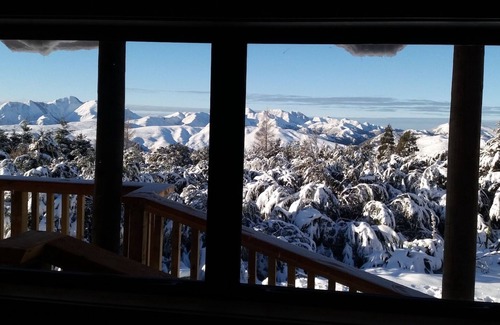 Affordable chalet with magnificent views of the surrounding mountain landscape. Peaceful setting with wonderful private balcony. The chalet is cosy for two, and has room for up to eight if people sleep on the mezzanine floor. The lodge is fully equipped and has everything you need to make your stay comfortable.