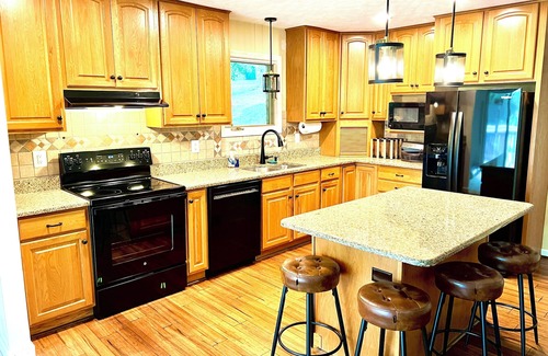 With four bedrooms to sprawl out in, rest assured that everyone will have the space they need to get comfortable. The rooms are equally spacious with great perks like TVs, work desks, high-quality linens, ceiling fans, and ample storage space. The primary bedroom even has its own private access to the deck and lounge seating. A great additional interior perk, the downstairs family room includes a sleeper sofa, DVD player with movies for family movie night, and plenty of board games. The basement family room is kept warm thanks to the wood-burning stove. The bottom level also has a kitchenette for movie night snack. Off the kitchen upstairs is a and a separate laundry room and pantry.