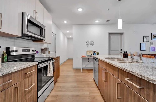 Step into style and comfort with thoughtfully designed spaces featuring luxurious wood-style flooring, stainless-steel appliances, and stunning tile backsplashes complemented by sleek granite countertops. Each home boasts high-powered Wi-Fi, a deluxe 65” flat-screen TV, and contemporary furnishings. Soaring nine-foot ceilings, designer lighting, and ceiling fans create an airy and inviting atmosphere.