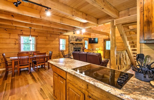 CABIN PERKS: Flat-screen TV, wood-burning fireplace, 6-person dining table, cozy loft, basement living area