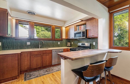 Schambra House is a renovated 1935 home in a well-established family-friendly neighborhood. Designed by Lewis Stevens who studied under America's most significant architect, Frank Lloyd Wright. In 1934, Wright passed his craft onto Lewis Everett Stevens at the Taliesin Fellowship. In the year following the training, Mr. Stevens created this house for the Schambra family. Stevens left us an architectural gift, and we have renovated it to share with you. Welcome, to Schambra House. Superb architecture has a way of communicating with you at an emotional level as you move from room to room. You will find Schambra House to be a space inviting you to experience your emotional journey. Midland is a town filled with many Mid-Century Modern delights. Many were created by Alden B. Dow, a cohort of Lewis Stevens at the Taliesin Fellowship. To our knowledge, Schambra House is the only Midland property, inspired by Wright’s apprenticeship, available for short-term stays. Now, truly experience a home the way that Wright and all his apprentices intended you to; live in it for a time. We invite you to make Schambra House, Your House. The house is within a 10-minute drive of most of Midland’s activities including the Dow Diamond (Great Lakes Loons Baseball). It is a mere 0.3-mile walk from Dow Gardens, The Canopy Walk, and the Midland Center for the Arts. It is close to the Dow Headquarters and MyMichigan Hospital if you are in town for work. You are only 15 minutes from MBS Airport and within a 20-mile radius of Central Michigan University, Northwood University, and Saginaw Valley State University. Soaring Eagle Casino is a short 30-minute drive away. Functionally experience art and nature, through the house designed by a talented architect. The private spaces in this house have been designed to help you unwind. Two bedrooms have queen-size beds and a shared bathroom. One of these rooms also has a desk and chair. The lower bedroom has a king-size bed with a bathroom adjacent to its door. The two bathrooms are stocked with basic amenities. There is a dedicated office space large enough for two people with inviting windows to the backyard and two monitors. There is high-speed internet throughout the house. Also, check out the unique Kid Nook for the younger at heart. Bring family and friends to enjoy indoor and outdoor games together. The rec room includes a Crokinole board and dart board that will help you reconnect with family and friends and perhaps go home with bragging rights. Enjoy corn-hole, Giant Connect Four, Tipsy Toss game, and more for outdoor fun with games accessible from the back of the garage (the front is reserved for owner storage). A cruiser bike is also available for your use during your stay. Or you may choose to simply relax in the enclosed backyard by sitting on the deck beside the tranquil koi pond watching our family fish. Names of the fish are provided to guests so you can get to know them better. 😊 Schambra House is situated toward the end of a quiet cul-de-sac steps away from a small neighborhood park. It is an intimate neighborhood, but the home’s architecture creates a private experience. A kitchen with custom-built cabinets and shelving appropriate to the home’s architectural period will invite you to cook a quick meal or family sit-down dinner. Enjoy a meal at the dining room table that seats eight comfortably or at the outdoor dining space on the patio. There is a pantry, full-size appliances, and all the accessories needed. Enjoy coffee at the personally crafted bar made from black walnut wood milled from the owner’s family homestead. Please note that Schambra House has several levels to explore with many stairs. Although sturdy handrails (also handmade from the family’s black walnut wood) are provided, some people with limited mobility may have difficulty accessing all levels of this historic home. Experience a home built in 1935 for the needs of the Schambra family but restored and reimagined for yours in 2024. Keyless entry, you will be sent the code via the Airbnb app from Yale shortly after the reservation is confirmed. Guests have access to the whole house, all four levels, patio, yard, and the back of the garage. The washer and dryer are in the lowest level. Guests do not have access to a small owner area near the lower level nor the front of the garage. All parking is outside in a driveway that will accommodate 3-4 vehicles. We live in Midland and would love to meet you if you desire. The check-in process is keyless so you can come and go as you prefer. If you need something, however, we are just a message away. Schambra House is a family-friendly travel experience. We are a non-smoking and pet-free property, with 10 PM outdoor quiet hours (respectable voice levels are acceptable). The house is fully stocked with towels and bedding/pillows all of which have been laundered especially for each guest down to the mattress and pillow protectors and each layer of bedding. You won't need to worry about cuddling up under the blankets and comforters here. They are fresh each time just for you. We provide 2 toilet paper rolls for each bathroom (please use that provided as our sewer system is historic just like the house) and 1 paper towel roll. Shampoo, conditioner, body wash, dish soap, hand soap, laundry detergent, and dishwasher pods are provided. The kitchen has pots, pans, dishes, a microwave, toaster, blender, wine opener, and three ways to make coffee along with a hot water kettle for tea. We provide locally roasted coffee and tea. There are 42" televisions in each bedroom, and 55" televisions in the living room and rec room, each with Roku. PLEASE BRING your logins for your streaming services. Rokus are set up for “guest mode” so you can log in and be automatically logged out at noon on the day of your departure. ROKU has some free options for your watching pleasure if you do not have streaming subscriptions. No local TV service is provided. Pleas