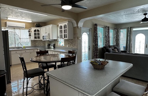 Located on the east end of the island at Scott Beach by Compass Point two minutes walk to the beach. 2 bedrooms, 2 bathroom, sleep 6, Air condition, Electric Range, Microwave, Granite Counter Tops, Refrigerator, Washer/Dryer, Dish Washer, TV Streaming Service, Wifi. Has a large back-up generator (House is fully powered 24/7). Off-street parking, fully furnished. Very quiet, safe and friendly neighbor hood.