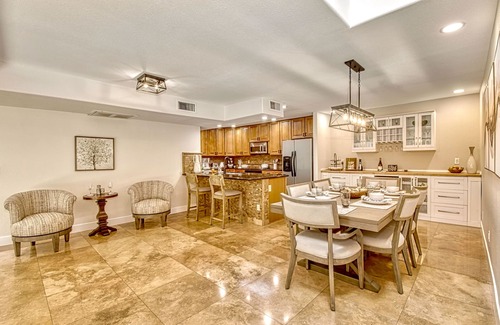 Enjoy the 48” flat screen TV, mounted above the classic wood burning fireplace. The available Wi-Fi network will help you stay in touch with the world, or look for that new restaurant. Views from the living room to the spacious patio beyond, are sure to please, while skylights flood the room with natural sunlight.