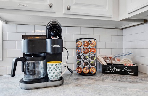 Make delicious meals in the kitchen, equipped with stainless steel appliances and all the cookware, dishes, and utensils you need to cook as if you were at home. You’ll even find a full charging station so you can plug your devices for convenient charging. Start your day off with a complimentary cup of coffee and enjoy it on the back porch.
