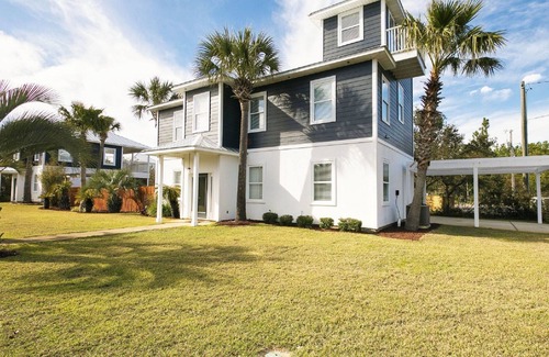 This upscale luxury complex with over 3200 sq feet features 5 large bedrooms and 5 baths between two homes offering 3 bedrooms in the main home and 2 bedrooms in the guest home, with a magnificent heated pool and deck between. Take in the pool for a few hours before heading to the beach for a leisurely afternoon. "C Breeze" offers a brand new chic stylized furniture and an elegant nautical decor. The living room gathering area has plenty of seating to watch TV, movies or sporting events on the wall mounted flat screen TV or just converse over cocktails. The couch pulls out to a sofa sleeper for additional guests. The living room opens up to a french door screened in covered patio overlooking the pool deck. The open concept gathering area gives way to the oversized newly remodeled kitchen with stainless steel appliances and dark granite counters. The kitchen is fully stocked with glassware, dishes, cookware, utensils and flatware. On the first floor you will find a king guest bedroom with shared bathroom and the laundry room.