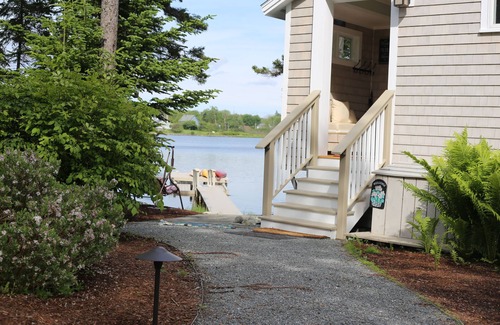 To see Sea Breezes in it's entirety, be sure to watch the video located at the very end of the photo gallery. Sea Breezes is a two-bedroom cottage directly on the shore with 3 baths. One bath has a shower and a washer/dryer; one has a two person shower and the third is single person shower. There is a king suite on the first floor with flat screen TV and two twins in the upstairs bedroom. A sleep-sofa is available in the twin bedroom for a maximum occupancy of six. The cottage faces east which makes morning coffee on the deck, overlooking the water, delightful. There is a shared dock with two other cottages with row boat and 4 kayaks at the water's edge for our tenants use. There is an enclosed outdoor shower along the walkway to the dock for Sea Breeze’s tenants use.