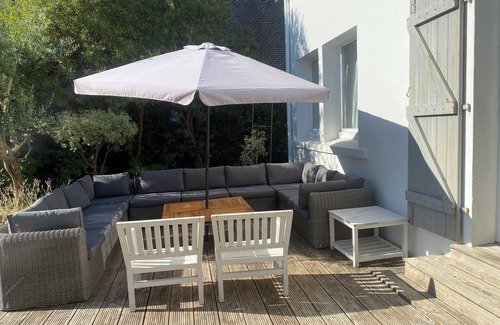 100 m away from a large white sandy beach, near a fishing harbour, shops and restaurants. Large comfortable not attached house with a pleasant fenced garden. The house, nicely decorated in a West Coast spirit, has a vast living room opening at ground level on to the garden. Equipped house with high-speed internet (ADSL).