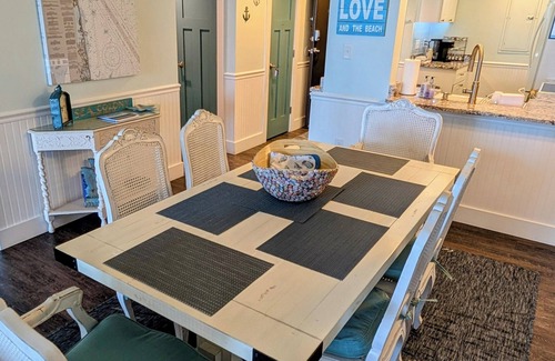 New for 2025: a solid wood dining table with seating for six, matching coffee and end tables, area rugs , and refreshed nautical beach-themed décor throughout the condo.