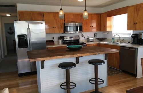 Sea Glass is a charming oceanfront beach cottage located at the end of a quiet cul de sac in South Nags Head . . . and the Atlantic Ocean is literally your backyard. The beach starts at the bottom of the stairs :-) Enjoy outside living on the large oceanfront covered porch with a tall table + 4 tall chairs, plus a picnic table. Grab a good book and a glass of wine and enjoy the salty air and shimmering ocean at sunset . . . my favorite time of day :-) Or perhaps a nap in the double sized hammock below is more your speed? Sea Glass cottage features a large open living area with bamboo flooring, lots of natural light, and lovely ocean views. The well equipped kitchen features stainless steel appliances, fridge with ice maker and filtered water on door, and an island bar overlooking the adjoining dining and living rooms. Sea Glass accommodates 6 people (4 adults & 2 kids). There is an oceanfront queen, an oceanfront twin bunk room, and a king bedroom with it's own half bath. The shared full bath features a shower with tub should you need one for the kids . . . but trust me, you'll be taking all your showers in the large private, enclosed outside shower with hot and cold water.