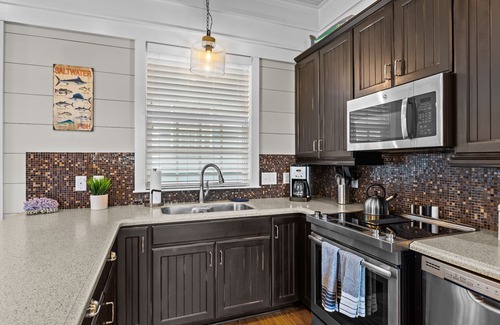 This bottom floor condo in Front Street Village is attractively appointed. You will love the location, it’s adjacent to the Beaufort Hotel, 34 Degree North Restaurant and a short walk from the public boat ramp on Taylor’s Creek. The primary bedroom has an adjustable king size bed and private ensuite bath. Bedroom two has a queen size bed and bunk beds and an adjacent bath. The comfortable living room/dining and kitchen combination makes for a perfect space to entertain, or just relax on the spacious front porch and enjoy the breeze. There is a drip coffee/Keurig maker for a perfect cup of coffee to take out on the porch for a perfect start to a wonderful day. The unit is pet friendly (please contact your host for fees) and there is a place to park your boat across the street. Bring your golf cart or rent one nearby, as there is a charging station outside the unit. Book your stay at Sea Glass in Historic Beaufort today!. Call 252.342.4132 for boat parking.