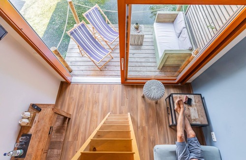 The lodges have a comfortable double bed (180 x 200 cm), which is accessible via a ladder in the loft conversion, and thus offer a unique sleeping experience. Relax in the cozy seating area, equipped with a coffee and tea station (including a kettle), and enjoy the quiet atmosphere.