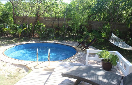 Sea Shanty, which sits in 1/4 acre of private grounds, has a roof top deck, overlooking the trees, with a view to the ocean beyond. There is a new 15 foot, private swimming pool for your use. The cozy master bedroom, which has King size bed, is directly off the deck on the second floor of the house. Downstairs is open plan, with the a small, but fully functioning kitchen, a dining area suitable for 4, and a lounge which has a TV and a couch. Off the living room, there is a small 2nd bedroom with a queen bed, and a single loft bed above. This second bedroom would suit children, but also works for a couple. The property is quiet and peaceful, with only few high end houses in the neighborhood.