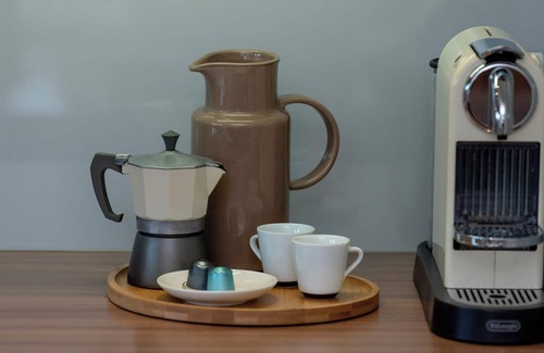 Electric hob, dishwasher, oven, coffee machine (capsule), toaster, washing machine, kitchen and tableware