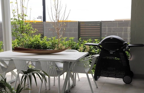 Outdoor entertaining area with outdoor table and a large Webber BBQ