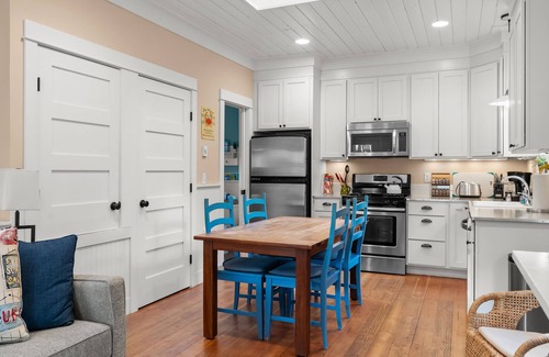 Beachy Keen features a kitchen with stainless steel appliances that is fully equipped for all your cooking needs. Cooking a meal can be a social event and with the rustic table and marine blue chairs close by, the conversation never needs to end.