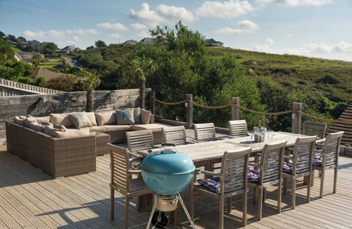 What truly sets this holiday accommodation in Bigbury on Sea apart is the incredible rear terrace. This expansive, multi-level outdoor space is designed for unforgettable moments, whether you're soaking up the sun on the large L-shaped sofa, dining alfresco at the ten-seater table, or simply enjoying the sea breeze with a glass of wine in hand. Cushions, loungers, and a charcoal BBQ make it effortless to settle in for the day.