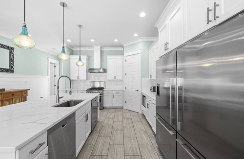 The first floor of Waves boasts a guest bedroom furnished with a king bed, complete with a private bathroom featuring a shower/tub combo. The open-concept living, dining, and kitchen areas offer a seamless flow and overlook the inviting pool. The gourmet kitchen is a chef's dream, equipped with premium appliances, including 2 Fisher & Paykel refrigerators, 2 dishwashers, and a 5-burner gas cooktop. The island with seating for 3 provides a cozy spot for casual conversations. Adjacent to the kitchen, the living area showcases two wrap-around sofas facing a 65" Roku TV, creating the perfect spot for relaxation. Additionally, two dining tables, each seating 8 guests, are nestled behind the sofas. French doors lead to a covered porch featuring dining tables and an outdoor kitchen with a convenient gas grill. Lounge on the chaise lounge chairs surrounding the beautiful pool, which boasts a wide sun shelf and a sitting spa.