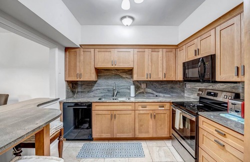 A fully equipped kitchen includes stainless steel appliances, granite countertops, a stove, oven, refrigerator, microwave, dishwasher, and coffee maker. Cooking basics such as pots, pans, and utensils are provided, along with a dining table for shared meals.