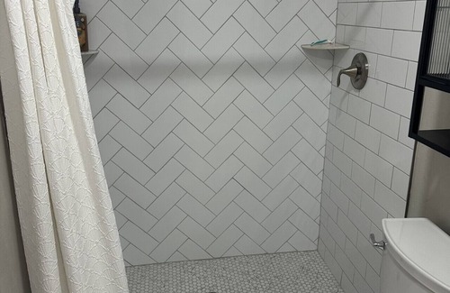 The spacious bathroom features a huge walk-in shower, complete with shampoo, conditioner, body wash, and a hair dryer for your convenience. A full-size washer and dryer in the unit make longer stays seamless and stress-free.