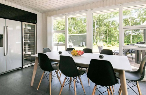 Holiday home located only approx. 600 meters from the fjord with a good, child-friendly beach. In the cottage there is outside as well as inside what you will appreciate when the holiday goes to Bork Harbor. There is a built-in coffee machine, wine refrigerator and American refrigerator with ice cube maker. You will find plenty of space for up to six people here. Outside you will find the wooden terrace to the east and south, completely undisturbed and nice with optimal shelter conditions and a good opportunity to enjoy the sun all day long. The cottage is heated by air / air heat pump, electric heating and wood stove. Free admission to Outrup Golf Club on approved 9 hole course, can also be booked as pay & amp; play. Not for rent to youth groups.