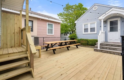 Enjoy this newly remodeled Seaside Heights cottage only blocks from the bay and blocks from the beach! This is the first season it is available. It has a kitchen outfitted with a fridge, stove/oven, coffeemaker, and toaster along with all dishware so you can make meals with your family and friends. Additionally, there is a living room with two pull-out couches (one full bed, one twin bed) and a 50-inch smart flat-screen TV. There are 2 bedrooms; one room has a queen bed and the other has a full bed. The backyard escape is perfect for relaxing after the beach. There is a large patio table with string lights overhead, cornhole boards, and even an outdoor shower! 5 beach badges are included per house, along with beach chairs.