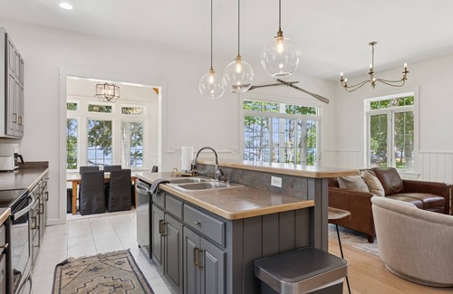 It shares a huge, level, sandy beach that is perfect for kids, picnics and playing! A beautiful spot to watch the sunset! Big enough for two families to stay comfortably. Large primary bedroom with bath overlooks the lake. One mile to shopping, restaurants, and all other amenities that North Windham has to offer.