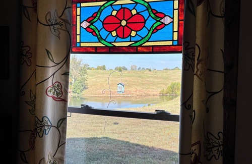 Awake in the mornings and be greeted by wild deer grazing in the fields; birds singing; and geese relaxing by the pond. Take a walk and enjoy picturesque views of the surrounding hills, sunrises, sunsets, pond, birds and other wildlife. Sit back and relax in a rocking chair or in a swing on one of the porches. There are also benches around the pond where you can watch the fish jump as well as the sun rays glittering on the water. Catch and release fishing is permitted in the pond. Wrap up your day sitting around the large fire pit that has plenty of seating for everyone.