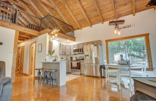 Inside, the cabin offers an open layout with a sleeping Loft, a full kitchen, a cozy living space with 2 sofas and a recliner, a flat screen tv, and an electric fireplace.