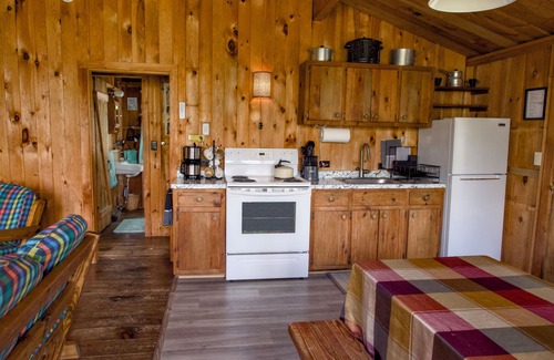 There is a large living area with kitchen (stove/oven, refrigerator and sink), eating area, sitting area with a wood stove. There are two bedrooms. The cabin sleeps five. The master bedroom has a queen sized bed. The second bedroom has a twin over queen bunk bed. There is WiFi and you can stream from your mobile devices to the TV. The cottage has a large covered porch for sitting. We also provide a charcoal grill. Parking is next to the cabin.