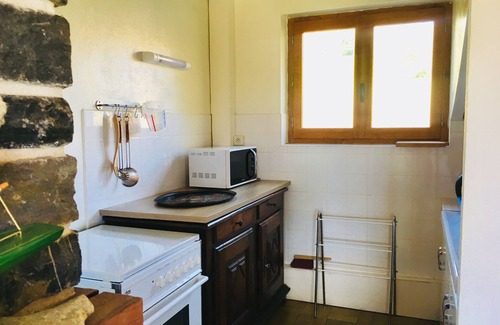 - a kitchen area: hob, electric oven, microwave, coffee maker, fridge