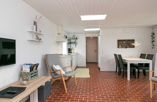 Layout: open kitchen(cooker(electric), hood, coffee machine, dishwasher, fridge, freezer(60-99L)), Living/bed room(TV(cable, german television channels, danish TV channels (DR1 and TV2)), radio), bedroom(2x single bed), bedroom(single bed, double bed, bunk bed), bathroom(floor heating)(bathtub or shower, washbasin, toilet), patio, heating(electric), terrace, BBQ
