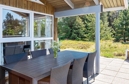 A holiday cottage on a lovely natural plot surrounded by trees in Thorup Strand, not far from the sea. Bathroom with whirlpool and sauna. Access the terrace from the combined living room and kitchen. A large aqua world with wellness department can be found by the camping nearby. Visit Fjerritslev with shops and restaurants. You can by fresh fish on the beach.
