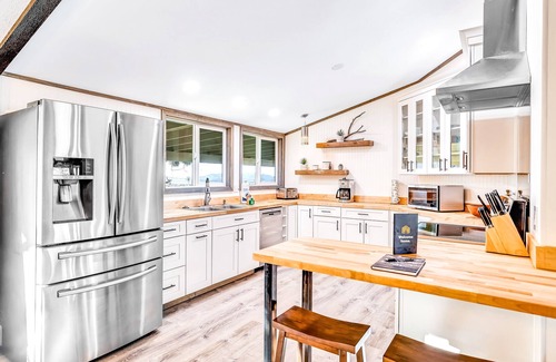At home, sip your coffee with a spectacular sunrise from your backyard or screened patio and step inside to make some breakfast when you get hungry. The open concept combines the comfortable living area, dining room, and kitchen, making it ideal for gathering together. The spacious, full kitchen features stainless steel appliances, warm butcher-block countertops, and all the cabinets and space you need to whip up a feast. Grab a bite together at the table inside, or dine alfresco on the patio. Spend the day exploring the ethereal landscapes of Joshua Tree National Park, then return home to relax for the evening. Stream the latest release or use the free, high-speed WiFi to catch up on remote work at the dedicated workstation. End the day as you began, back outside on the patio, but this time admiring the clear night sky and toasting your good fortune at booking the perfect desert escape.