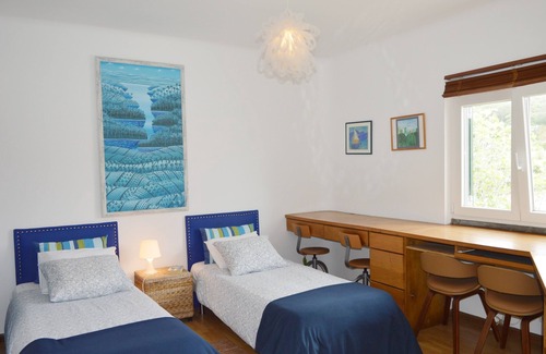 Also accessed from the main hall, we find a large twin bedroom (beds can be joined to form a large double) and its en-suite shower room; this bedroom leads to a smaller sitting-room/bedroom with 2 single beds and with direct access to the gardens and fabulous views.