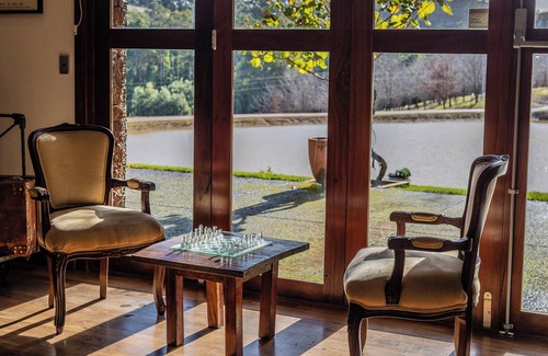 Next to the kitchen is a living area with two brown leather sofas and a TV. This leads through to a library where you can relax in a large lounging couch, put your feet up and read a good book or the kids can play games. Next is another living area with two black leather sofas and a reclining armchair. At the end of the building on the ground floor is the grand dining room with a 12 seater wooden dining table and 12 chairs. There is also a 1.8m round table with 6 dining chairs and a wine bar on wheels. All these ground floor rooms overlook the dam, truffiere, river and forest. The verandah runs the length of the lodge, overlooking the dam and forest, shaded by a grape vine canopy with views to the truffiere and river. Enjoy a glass of wine while the sun sets over the trees and the dam and stay out longer to enjoy the night sky, perfect for stargazing.