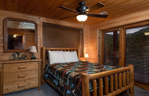 The front doors open to a spacious bright open floor plan accented by log walls and cathedral ceilings. A wall of windows to the peak of the cathedral ceiling fills the cabins interior with mountain views. To the left of the front door is the common area half bath. In the living room area a large stone gas log fireplace reaches the ceiling. Rich toned leather sofa and chairs provide comfortable seating around the fireplace. A flat screen TV with surround sound sits above the fireplace. Opposite the living area is the dinning table; positioned to take advantage of views of the fireplace and mountains while you enjoy diner. Past the dining area and to the left of the living room is the large kitchen. The kitchen is fully stocked with all dining and cooking utensils. The kitchen's breakfast bar seats four guest. The kitchen has all stainless steel appliances including a dishwasher. To the right of the fireplace a door leading to the master suite the only bedroom on the main level. A large stone gas log fireplace at the foot of the queen size bed creates a warm romantic glow and you can awake to the mountain view through the glass doors leading to the back porch. The master suite has a spa inspired bathroom. A large jetted tub is a great treat just before bed. A separate slate shower stands opposite the tub. To the right of the front door are stairs lead to the upper level and the lower level.