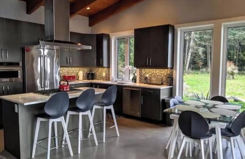 Gated, beautiful ocean front, modern home. Very unique semi-private getaway. A great west coast living experience; close to world renowned West Coast Trail, plus numerous other hiking trails in lush rainforests and many nearby scenic beaches. Sooke is known for excellent salmon and halibut fishing and whale watching. Kayaks and canoe rentals are nearby, plus several golf courses, including famous Bear Mountain courses in Langford, approximately 30 minutes away. Lovely city of Victoria is a 40 minute drive away. Choose to stay in...enjoy indoor fireplace or outdoor patio, while gazing at Olympic Mountains across the ocean view from the house and wildlife crossing the lawn surrounding the house. If there is a chef in you, the house is very well equipped.