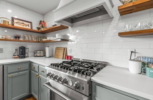 The home is equipped with a fully stocked kitchen with new appliances, including a gas-burning stove, washer and dryer, large capacity freezer, garage fridge, wine and beverage cooler, and all the cookware you need to whip up your favorite meals.