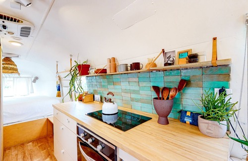 Located on a perfect Pedernales River perch, this completely renovated Airstream is just the place for a truly romantic getaway! Boasting desert-themed decor with orange, yellow, and green splashes of colors throughout, you will be able to slip right into vacation mode in no time. After days of exploring the surrounding area, throw on a favorite record on the turntable, and cook up a delicious meal on the adorable kitchenette complete with a mini-fridge, stove, and oven. When the sun starts to dip towards the horizon, throw on a swimsuit and soak in the plunge pools offering an uninterrupted view of the river and valley below. With no WiFi, this will be just the place to get away from it all and simply enjoy your favorite person's company!